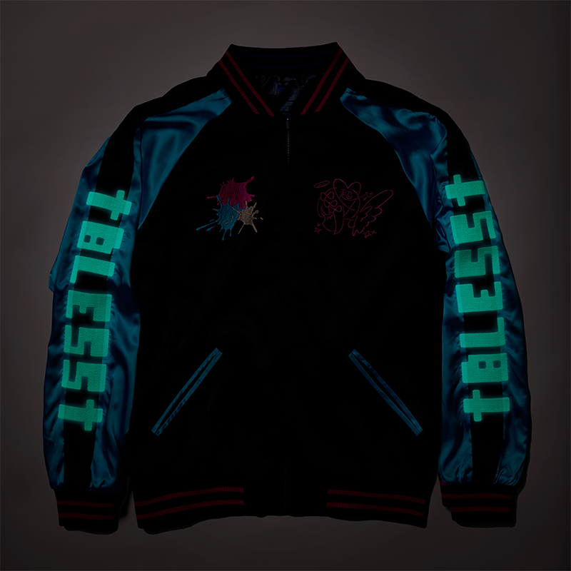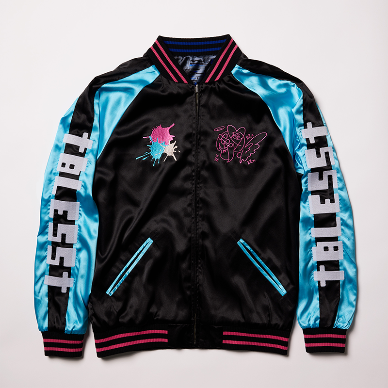 また、袖に入った BLESS(昇天)は、蓄光糸での刺繍で、注目の的間違いなし。